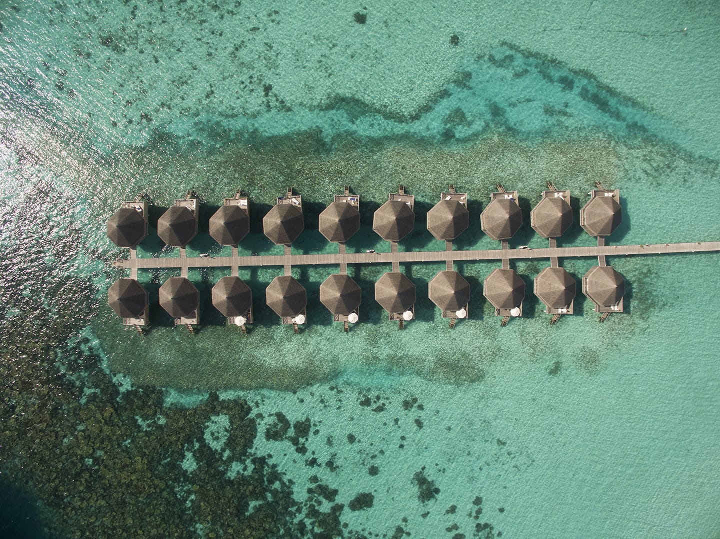 I Superior Water Bungalow sono ampi 65 mq e sono dislocati nella laguna; dispongono di bagno con doccia separata e vasca, tavolino con vetro per osservare il fondale, terrazza privata (sundeck) e accesso diretto all’acqua.