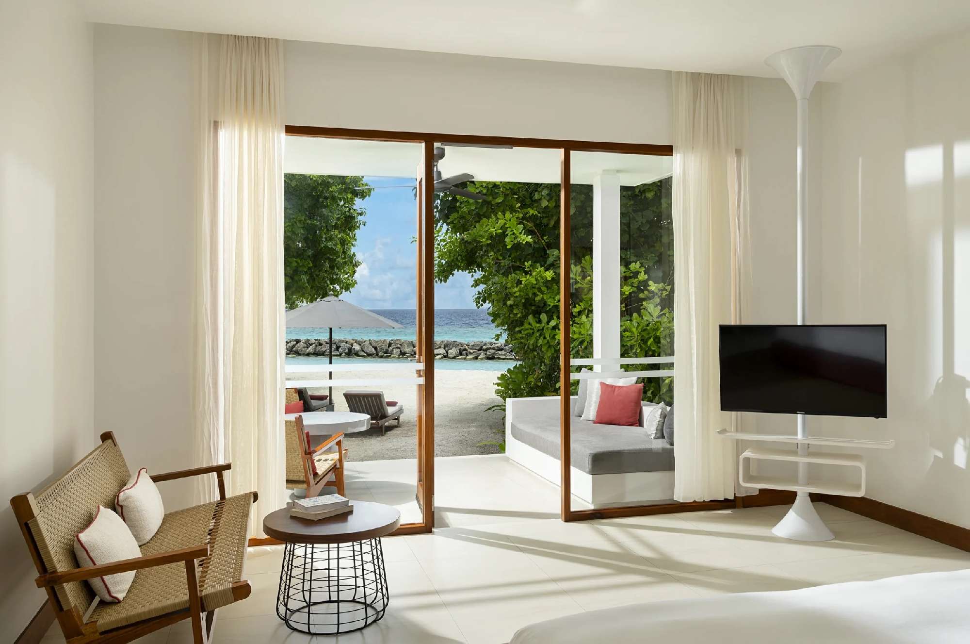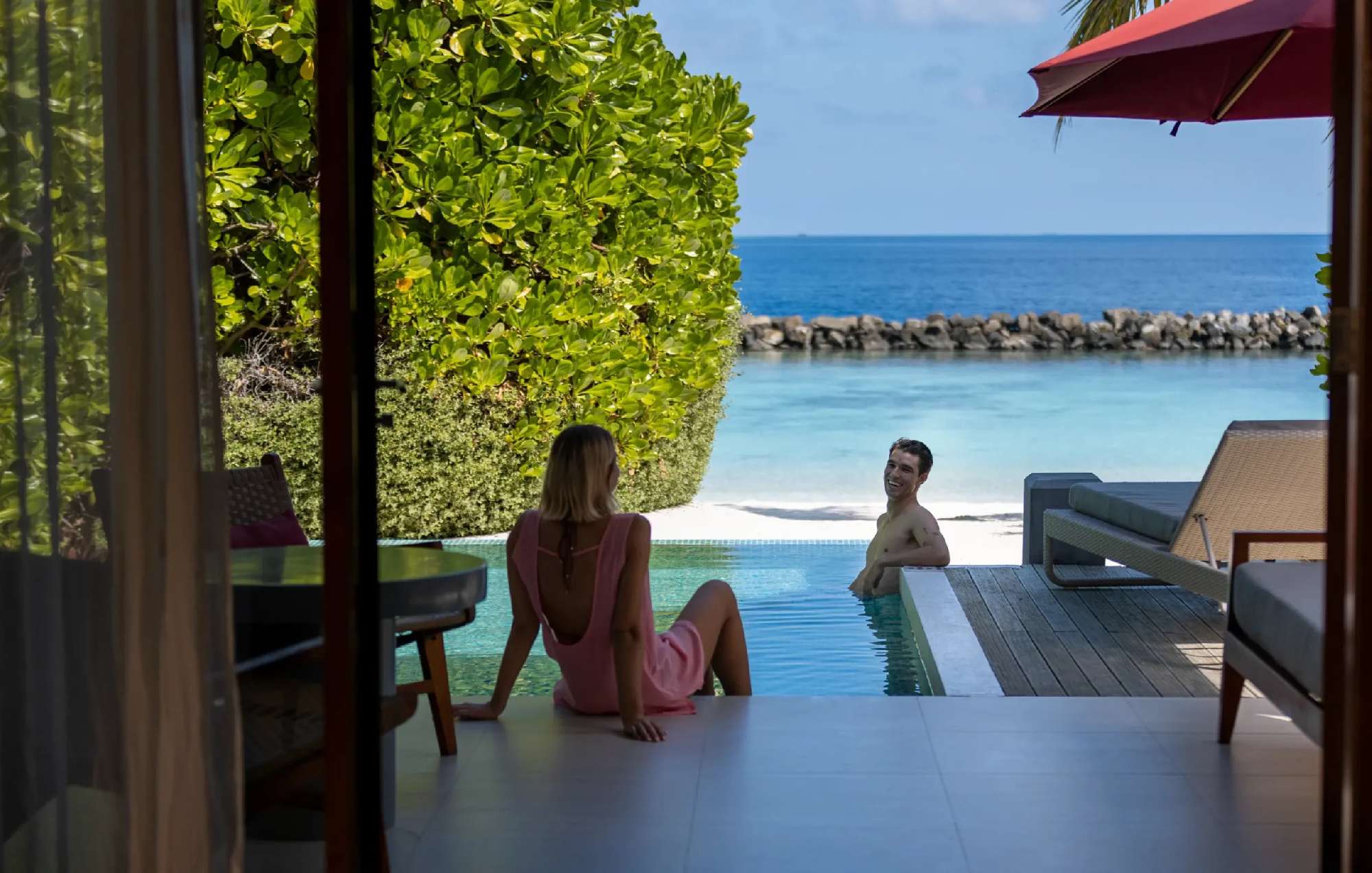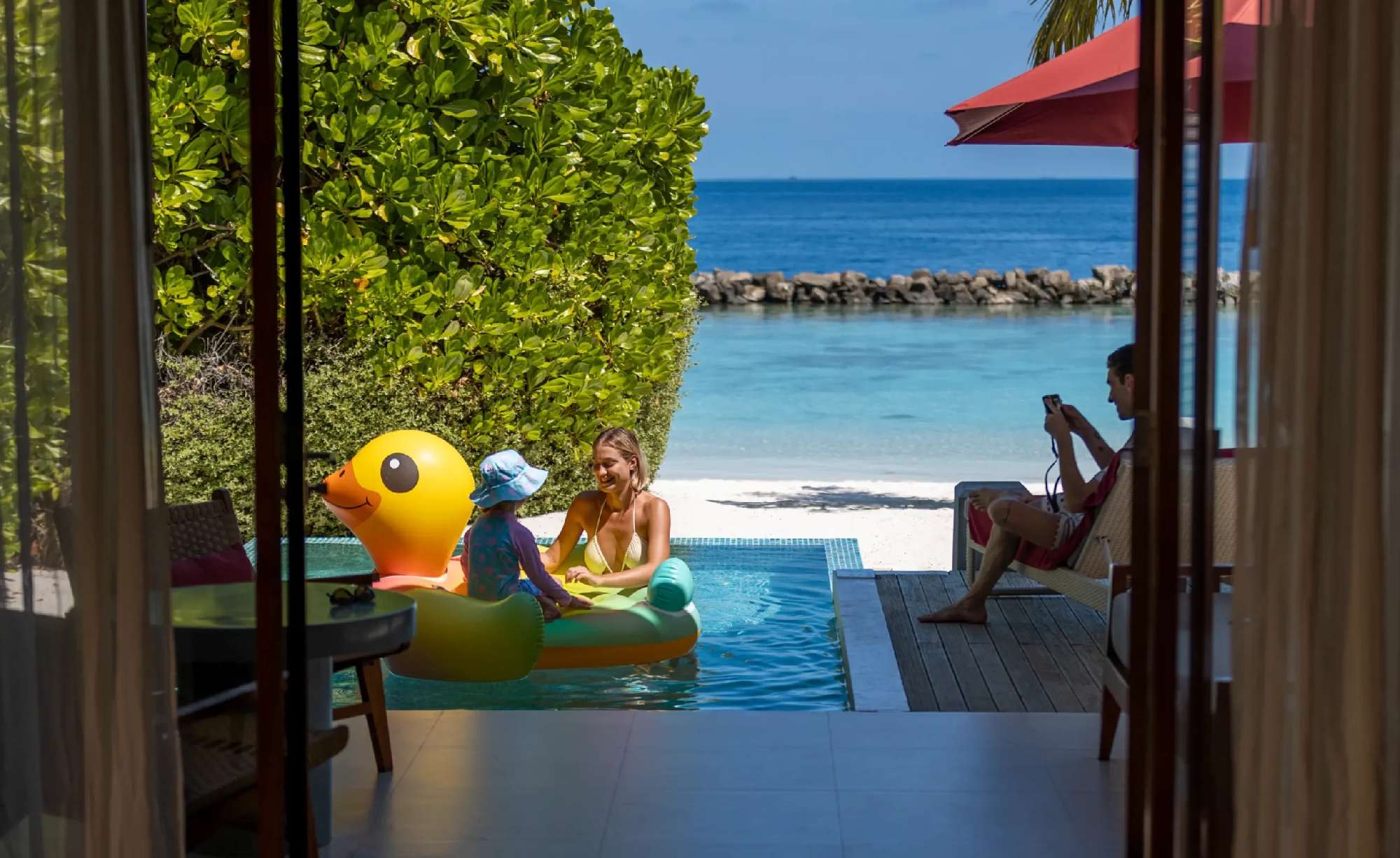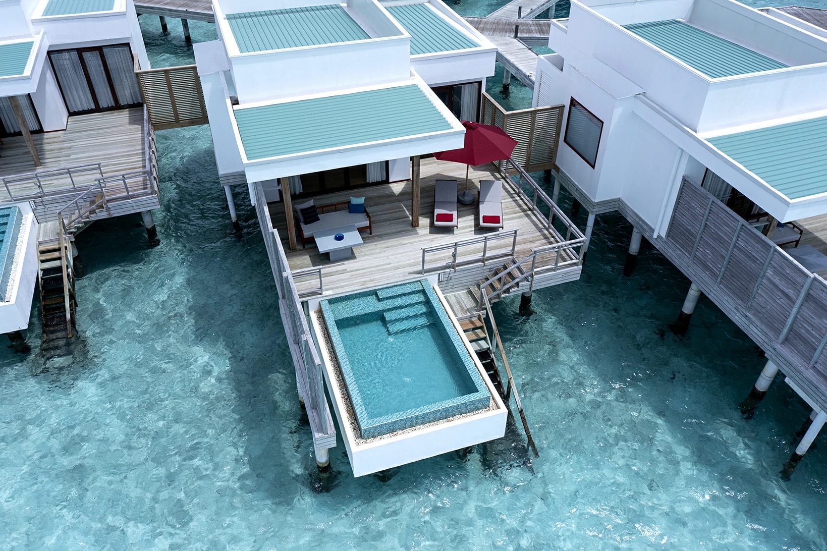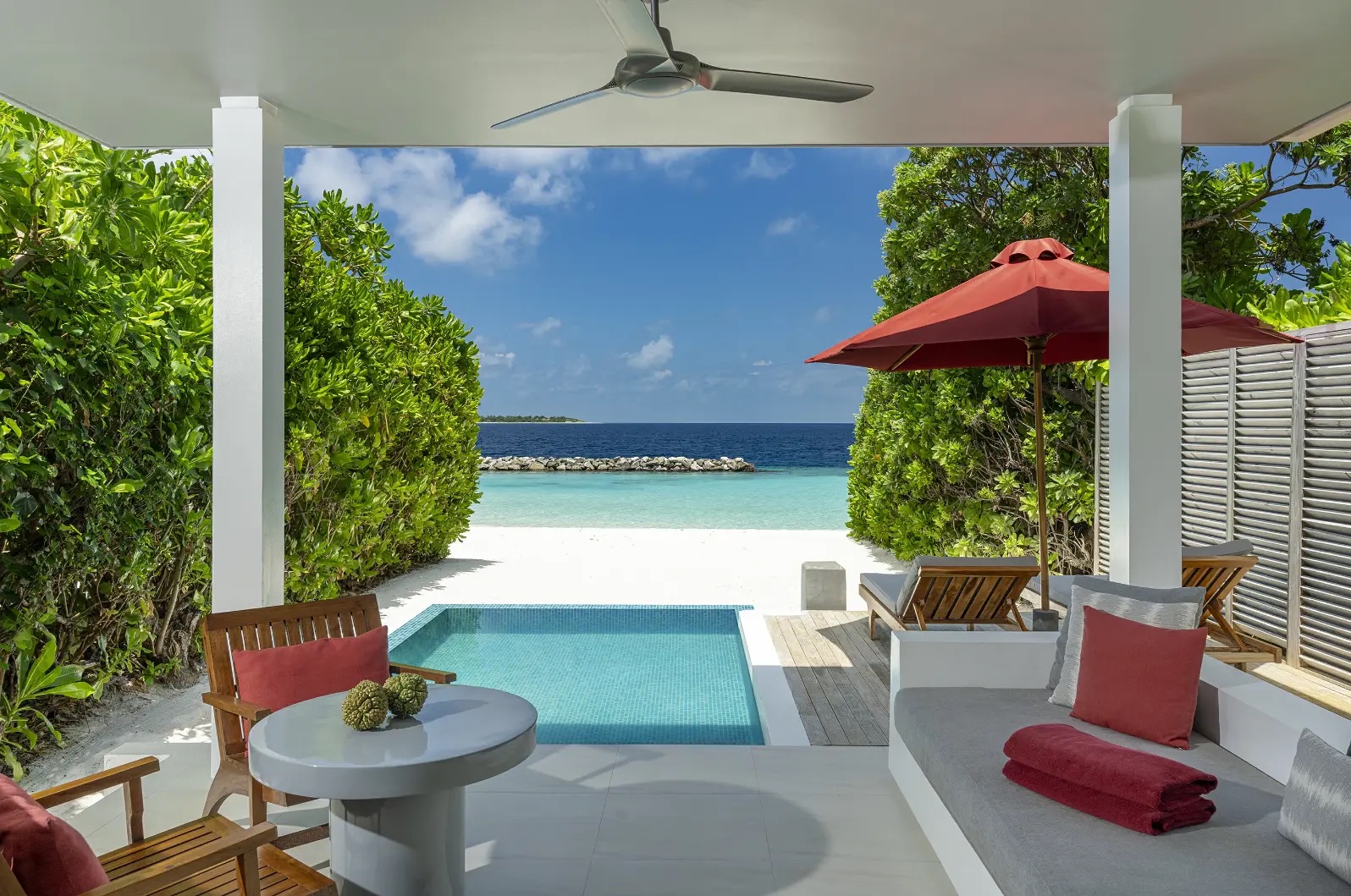 Two Bedroom Deluxe Beach Bungalow, Two Bedroom Beach Villa e Two Bedroom Dhigali Suite – soluzioni spaziose per famiglie o gruppi, con living separati, ampi deck e piscine private nelle suite di categoria superiore.