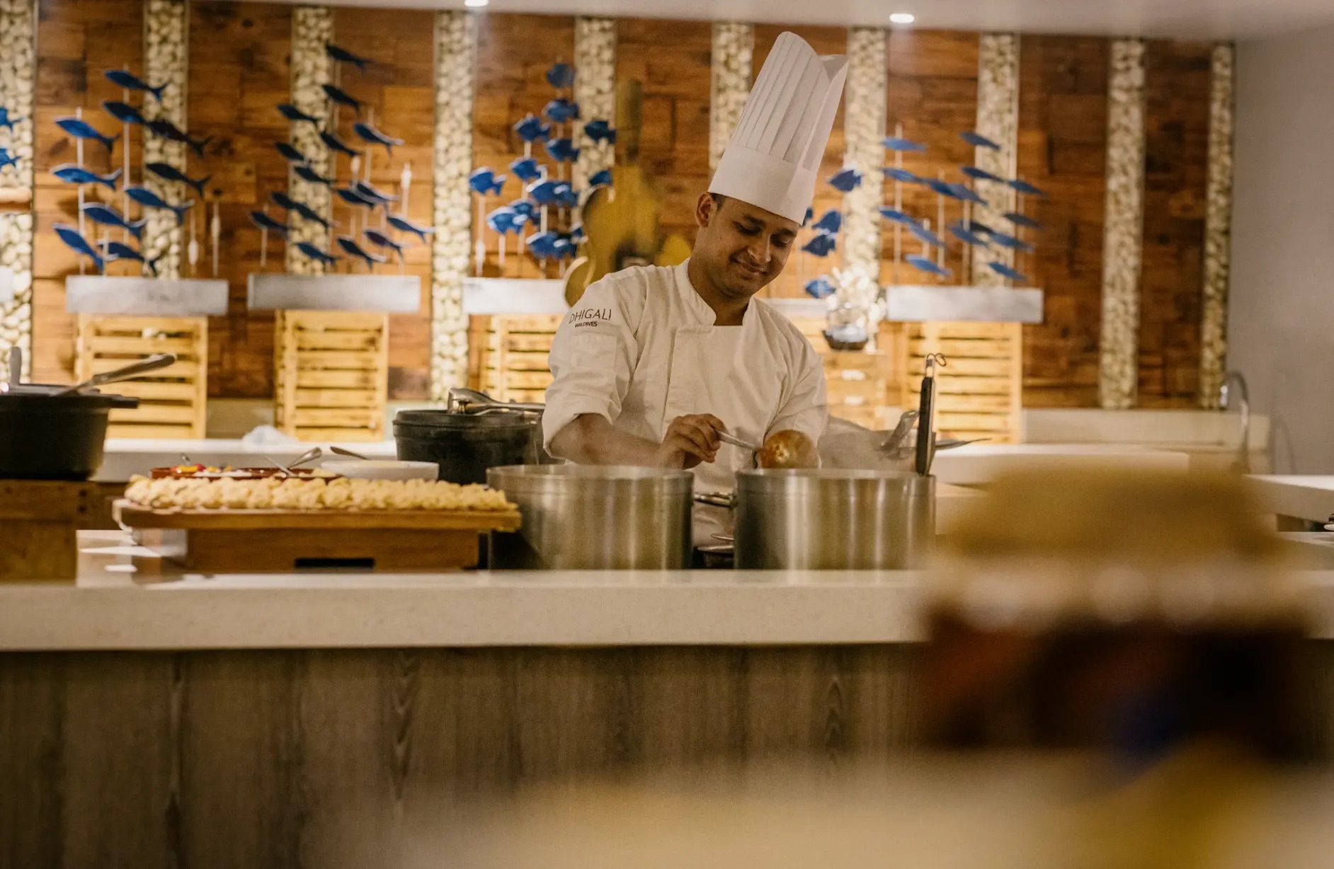 Dhigali Maldives offre un’esperienza gastronomica ampia e ben strutturata, pensata per garantire varietà e qualità durante tutto il soggiorno. La ristorazione è parte integrante della formula Premium All Inclusive, che consente agli ospiti di accedere a più ristoranti e bar dell’isola, con pasti à la carte, buffet, bevande selezionate e minibar incluso.