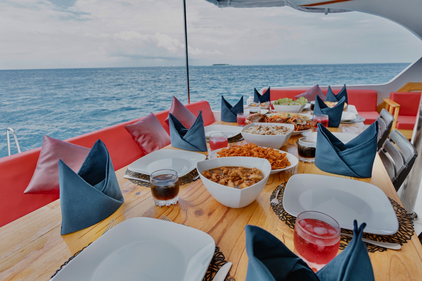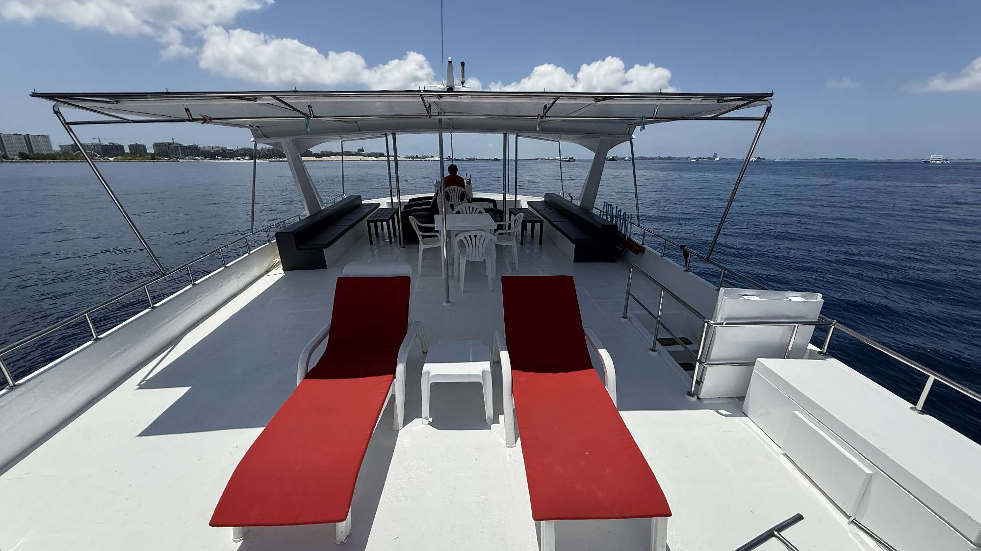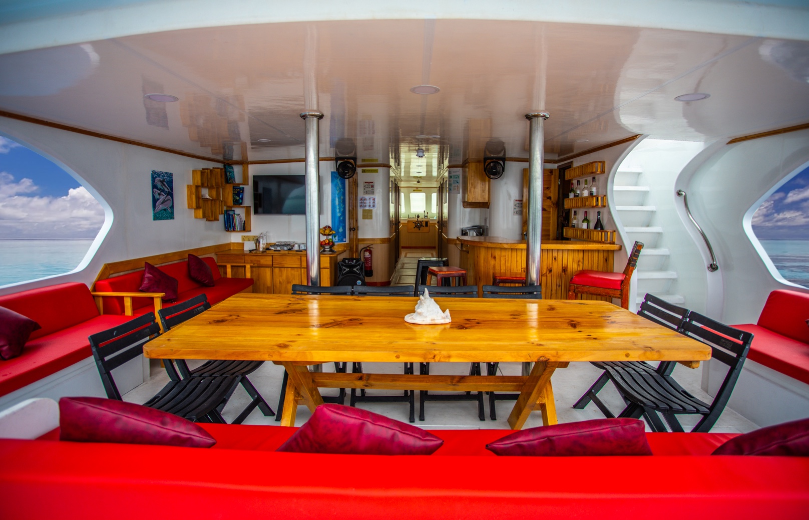 Il sun deck, arredato con sedute prendisole e lettini, è uno degli spazi più piacevoli per vivere la navigazione, rilassarsi durante le soste o godersi il panorama degli atolli. Nel complesso, il Misraab è una barca di dimensioni contenute ma ben organizzata, ideale per chi cerca una formula più intima e informale, senza rinunciare al comfort essenziale di una vera vacanza in safari boat.