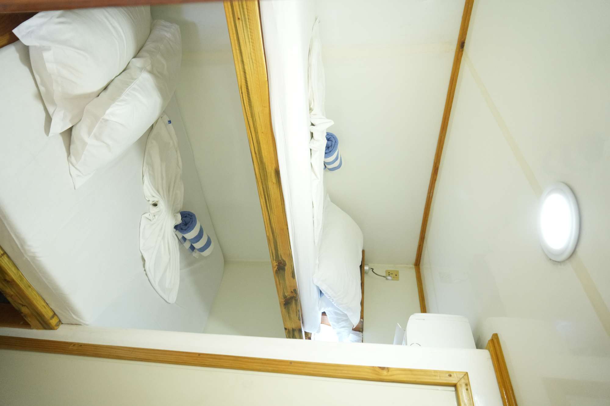 Il Misraab dispone di 4 cabine sul main deck, tutte climatizzate e dotate di bagno privato con doccia. Le cabine possono essere utilizzate come doppie oppure come family room per 3 persone, rendendo la barca adatta sia a piccoli gruppi di amici sia a famiglie o charter privati più raccolti. La capacità massima indicata è di 12 ospiti, con 5 membri di equipaggio a bordo.