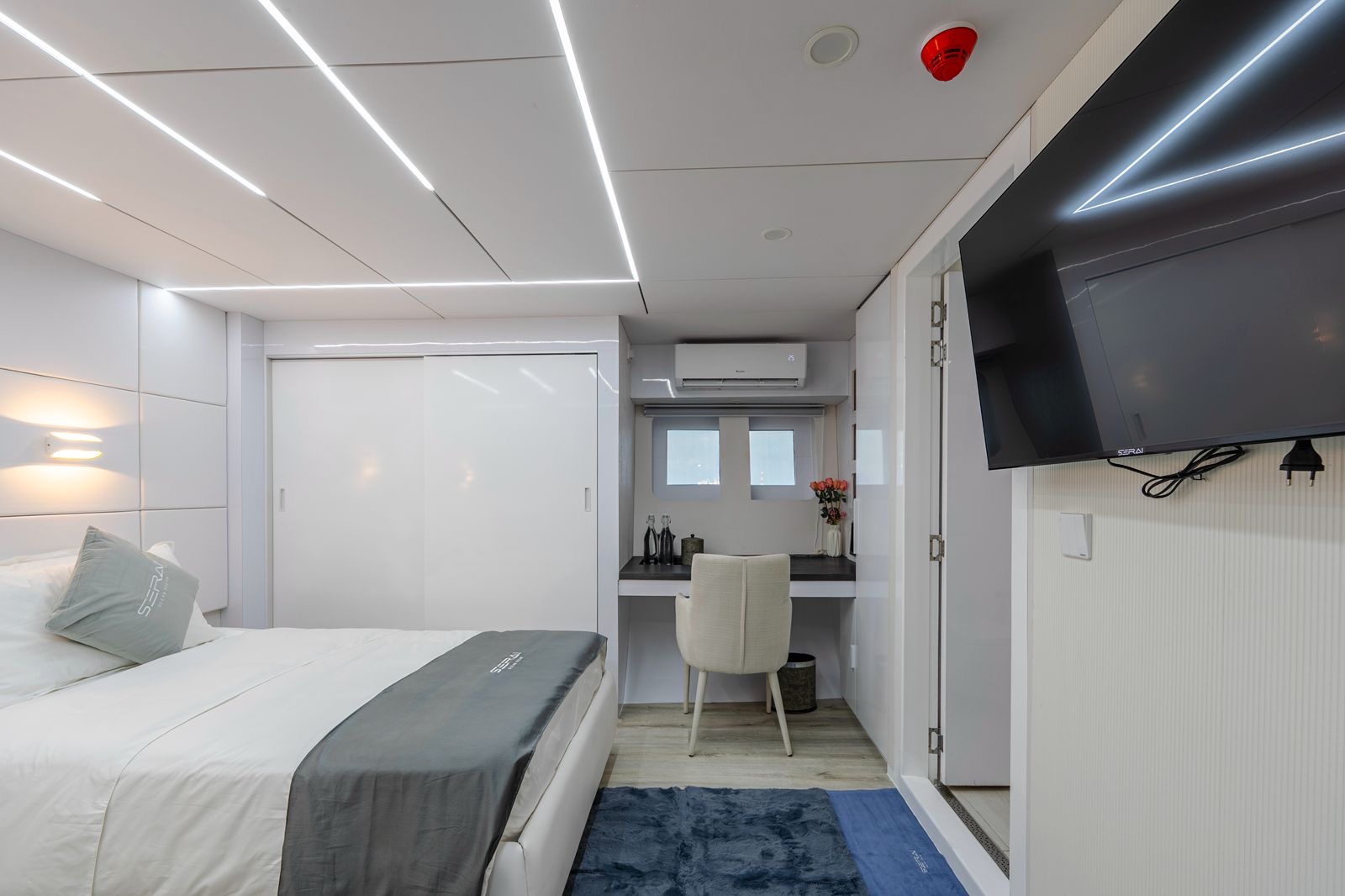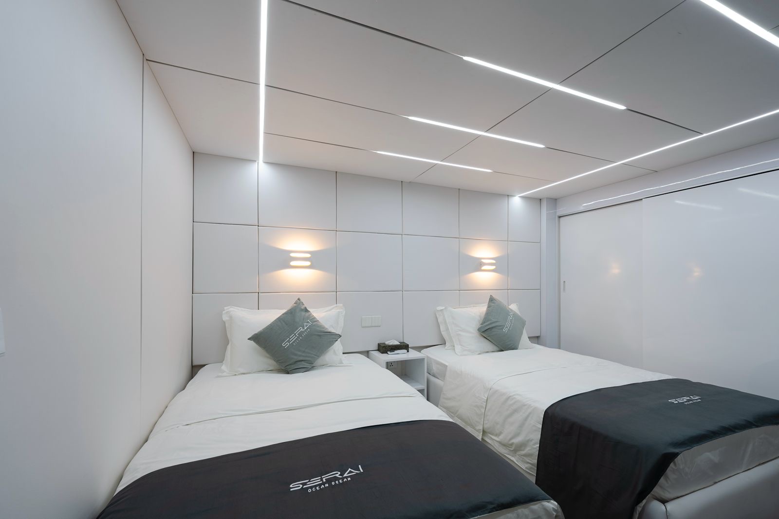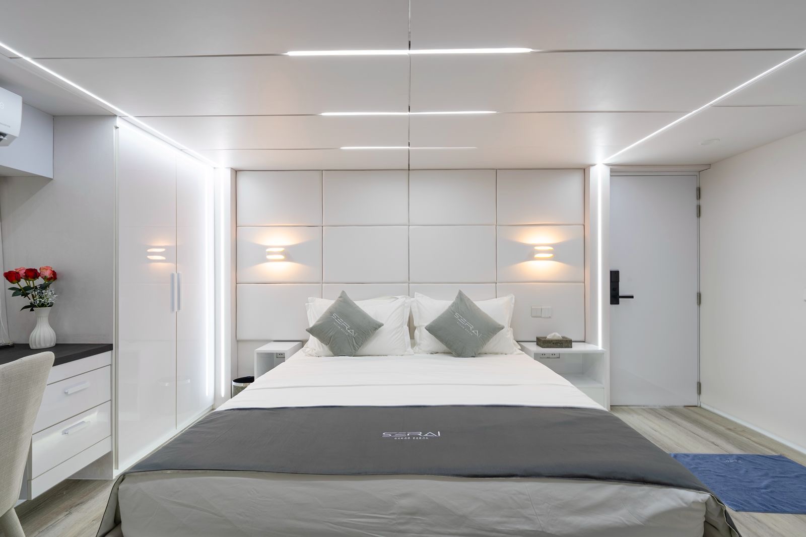 Serai Ocean Dream è distribuito su più livelli e propone ambienti raffinati, luminosi e ben organizzati. Le cabine, tutte con bagno privato, sono suddivise tra upper deck, main deck e lower deck e comprendono 2 Estate Suites, 2 Master Cabins e diverse Deluxe Cabins, con sistemazioni adatte sia a coppie sia a piccoli gruppi o charter privati. Gli interni sono curati in chiave contemporanea, con climatizzazione individuale, spazi di stivaggio dedicati e comfort pensati per una permanenza di livello superiore.