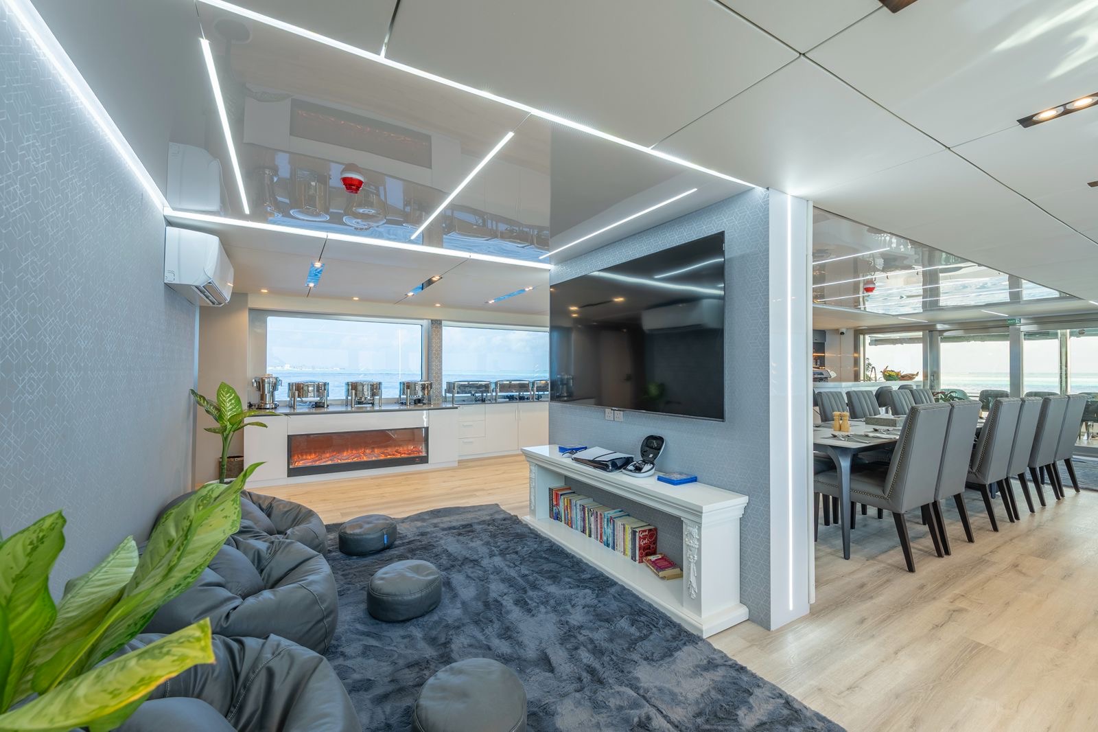 Sul sun deck trovano posto jacuzzi, lettini prendisole integrati, zone relax e area yoga, mentre l’upper deck ospita anche spazi per la ristorazione all’aperto e aree dedicate al benessere. Il main deck è il cuore della vita comune a bordo, con salone, area pranzo, bar premium, cucina professionale e ambienti concepiti per offrire una navigazione piacevole sia nei momenti di convivialità sia in quelli di relax. L’esperienza gastronomica è parte integrante del soggiorno, con cucina curata e possibilità di organizzare momenti speciali come barbecue su banchi di sabbia, cene private ed esperienze personalizzate.